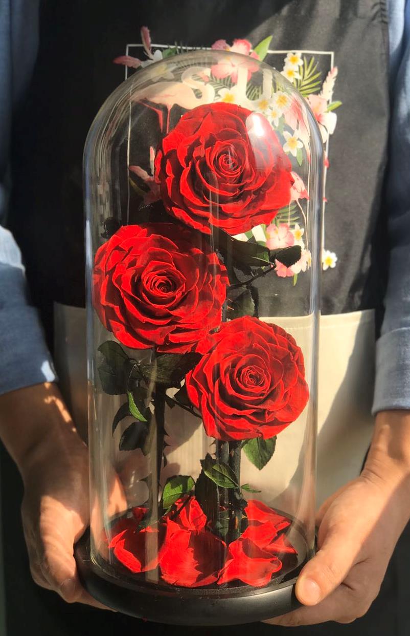 3 rose in glass dome